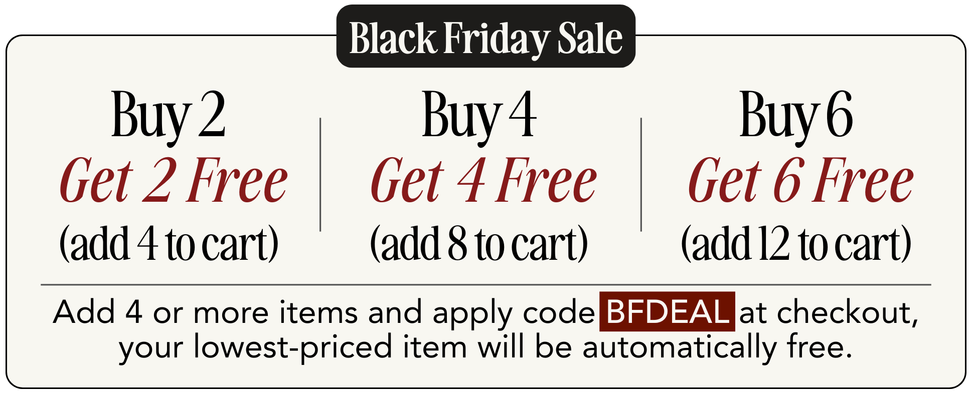 BLACK FRIDAY SALE: Add at least four pieces of jewelry to your cart. When you apply the coupon code 'BFDEAL' at checkout, the two least expensive items will automatically become free.