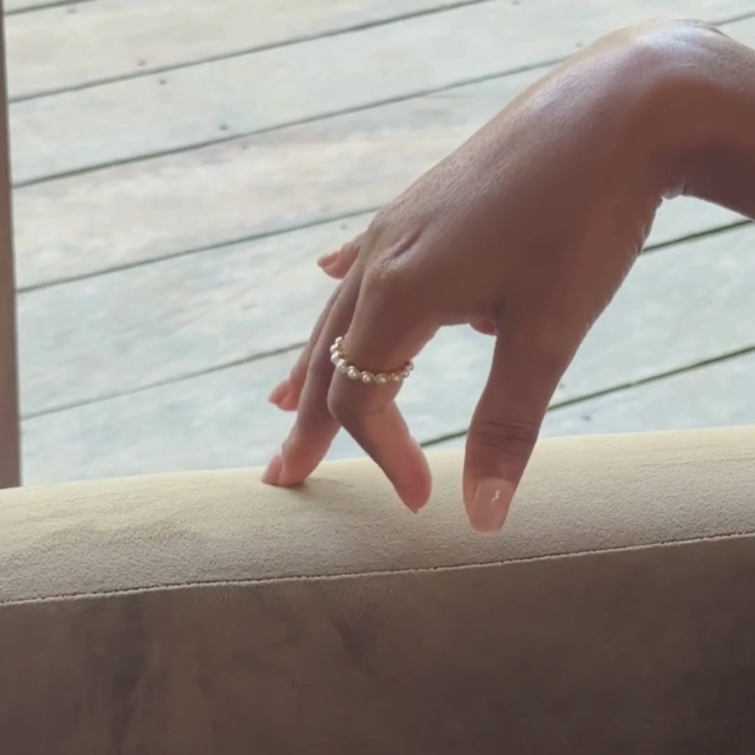 A permanent circle of calm, the Peace Ring features sixteen lustrous shell pearls in a classic eternity band. Smooth, radiant, and effortlessly chic, it moves with you—from morning espresso runs to sunset strolls along the coast.